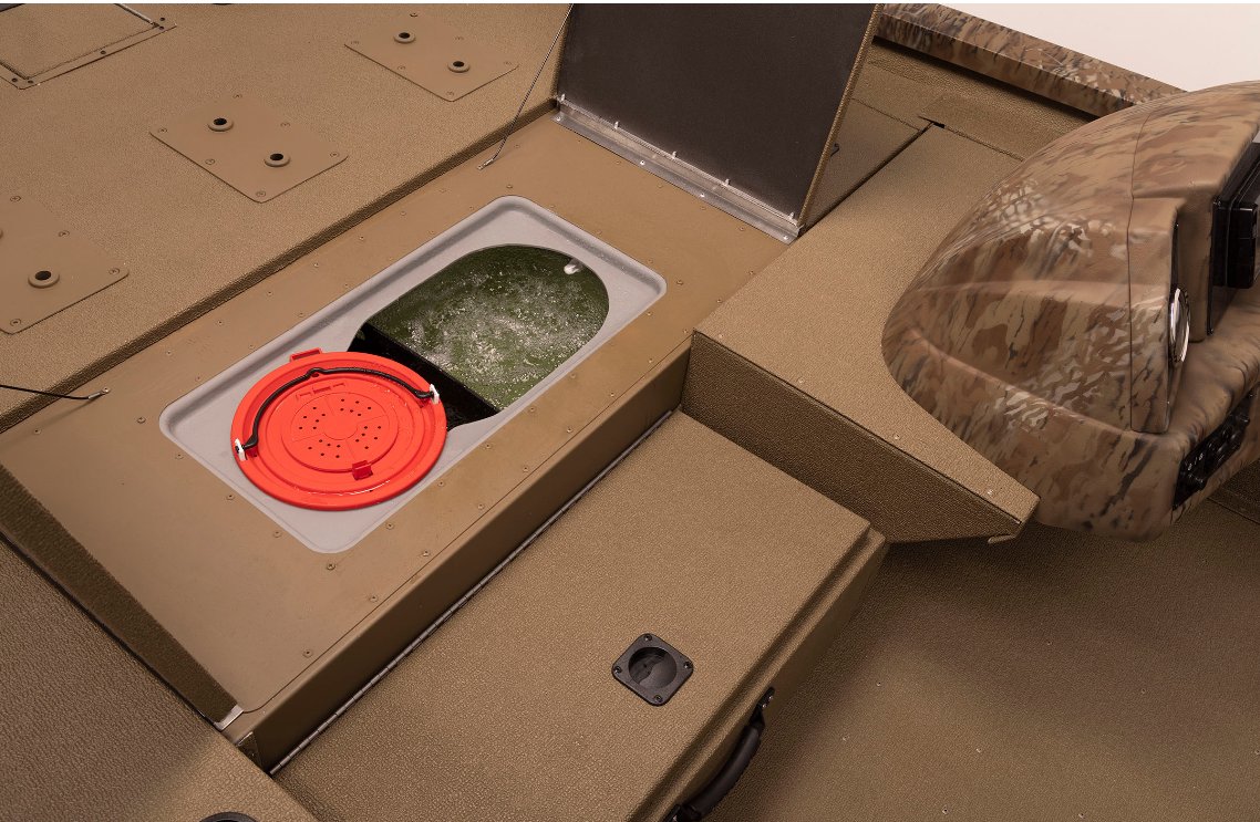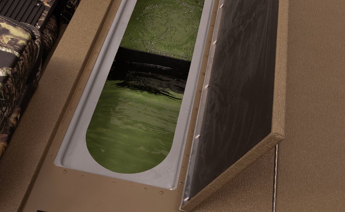 The stern livewell is 33 gallons, 15" x 45", with storage for smaller items on each side. |