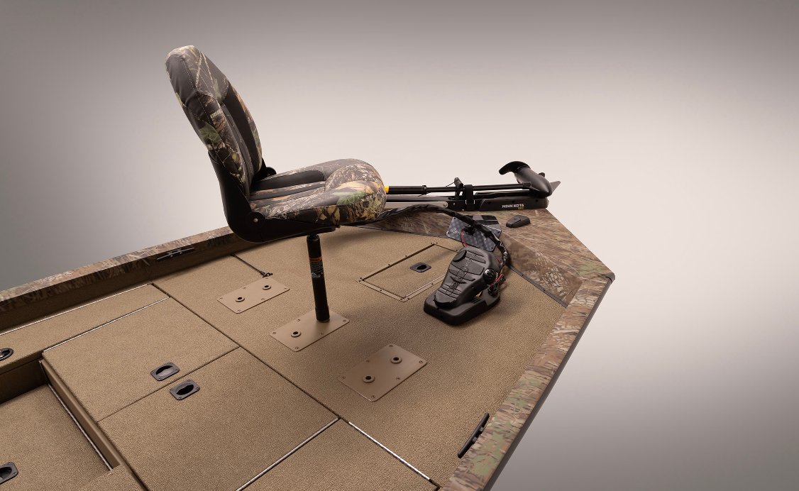 The spacious layout, with a beam of 92”, allows freedom of movement; the front deck alone has over 33 sq. ft. of casting platform. Two high back fishing seats can be positioned side by side when the best Crappie hot spot is located. |