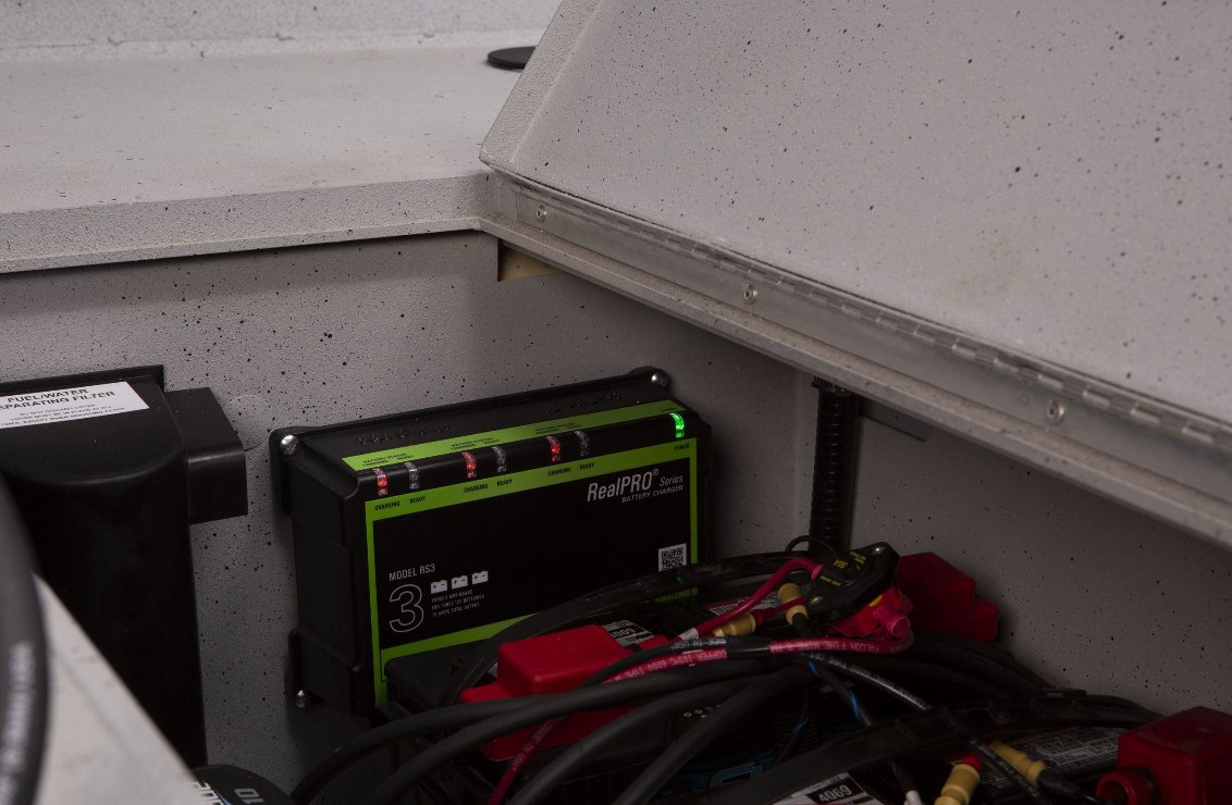 Standard three-bank battery charger makes sure you are always ready to "escape to the lake" when the bite is on. |