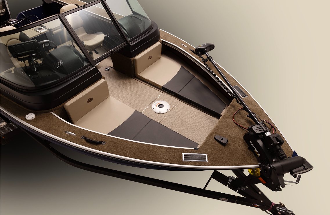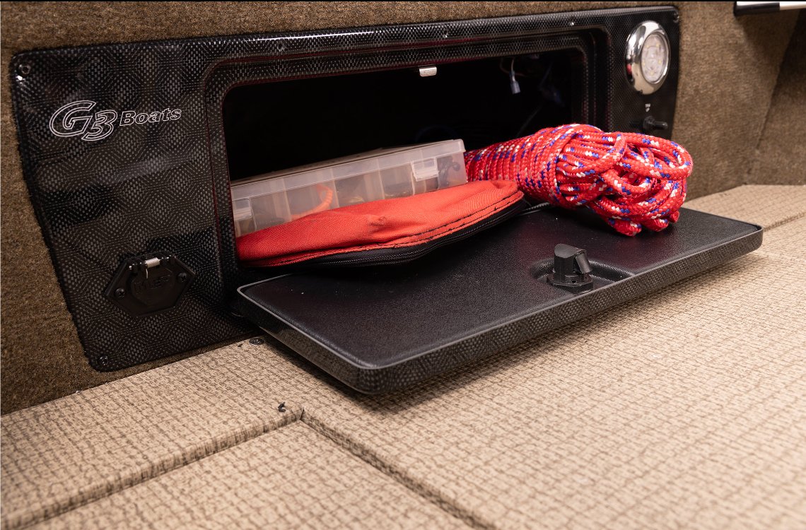 Bow panel storage box gives you that extra room for small items. Provides easy access to trolling motor plug, trim switch and has a courtesy light. |