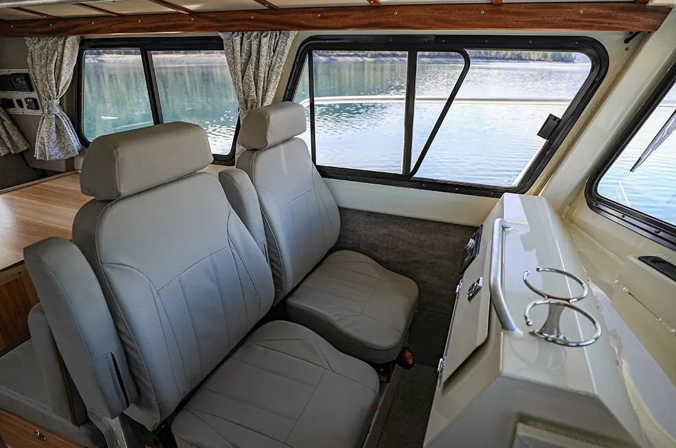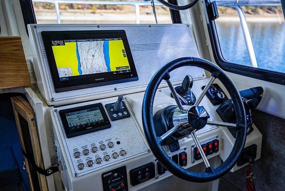 The spacious interior cabin is designed with 6’4” of headroom and is nicely appointed for cruising, cooking, and entertaining. As you step down into the forward cabin, you will immediately notice how roomy and comfortable the area feels. This is not a cramped cuddy; overnight accommodations are exceptionally nice. Amenities such as the upholstered walls and ceiling, port and starboard screened windows, LED lights, and power outlets all make for very relaxing nights. Overall the Adventure sleeps 4 adults, is rated for a crew of 11, and does so with hot/cold running water, cooktop, microwave, refrigerator, dinette, cabin heat, and a full head closet which includes a flushing toilet, sink, and a standup shower.