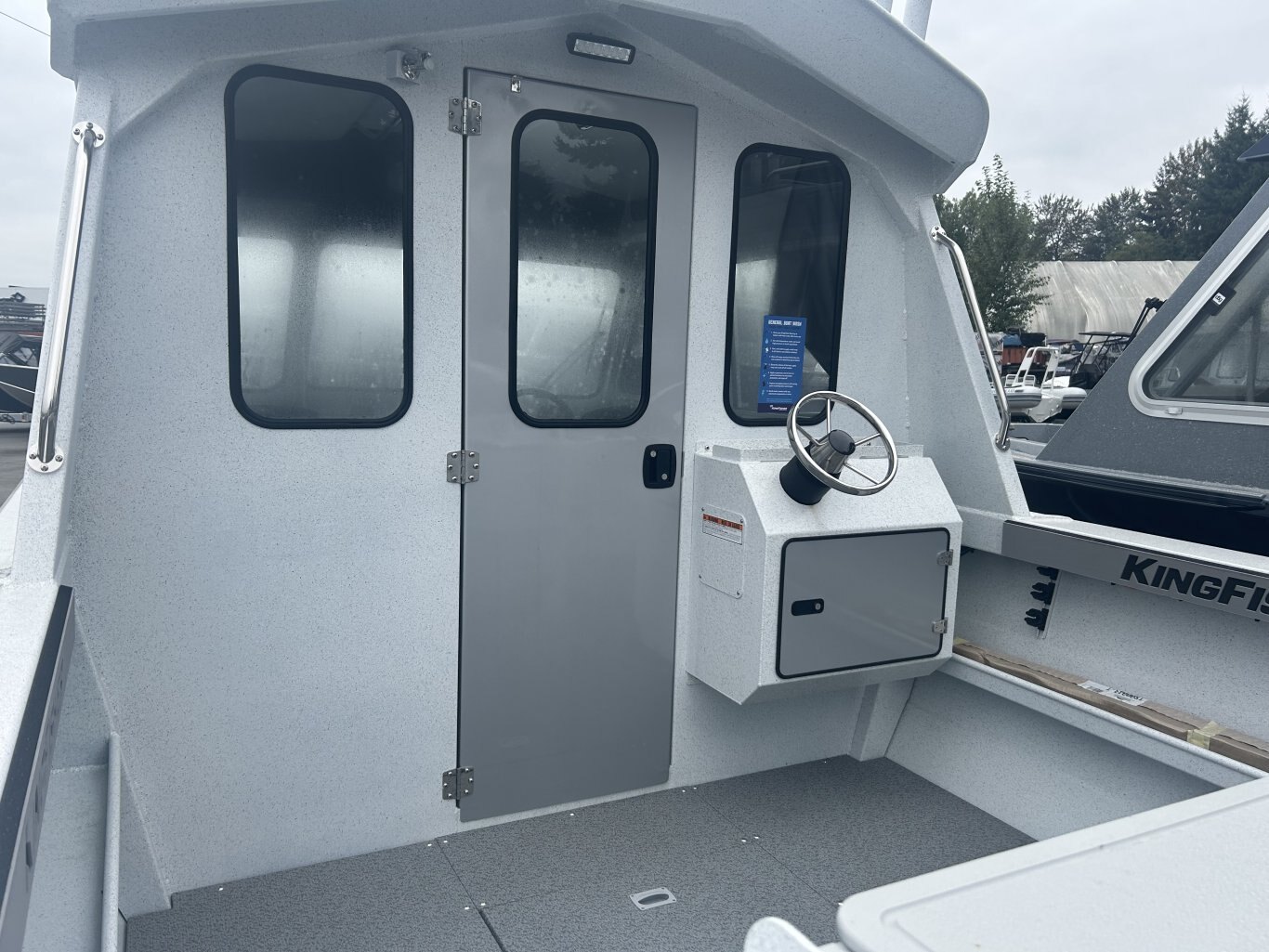 Standard Interior FeaturesEasy care marine vinyl floor 2 Fishmaster XL seats on silver painted aluminum storage boxes with pedestals Hydraulic steering with stainless steel wheel Speckle painted interior with carpeted lower hull sides Port side locking glove box Cabin in-floor storage locker Under bow storage with locking door |