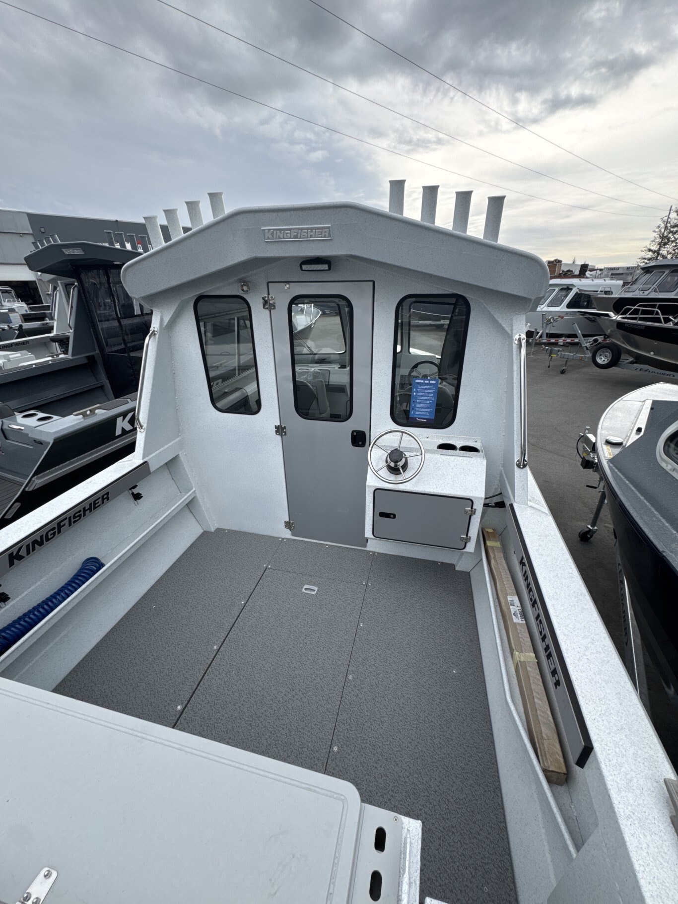 - 8 rod holders on cabin rooftop & starboard fish net holder