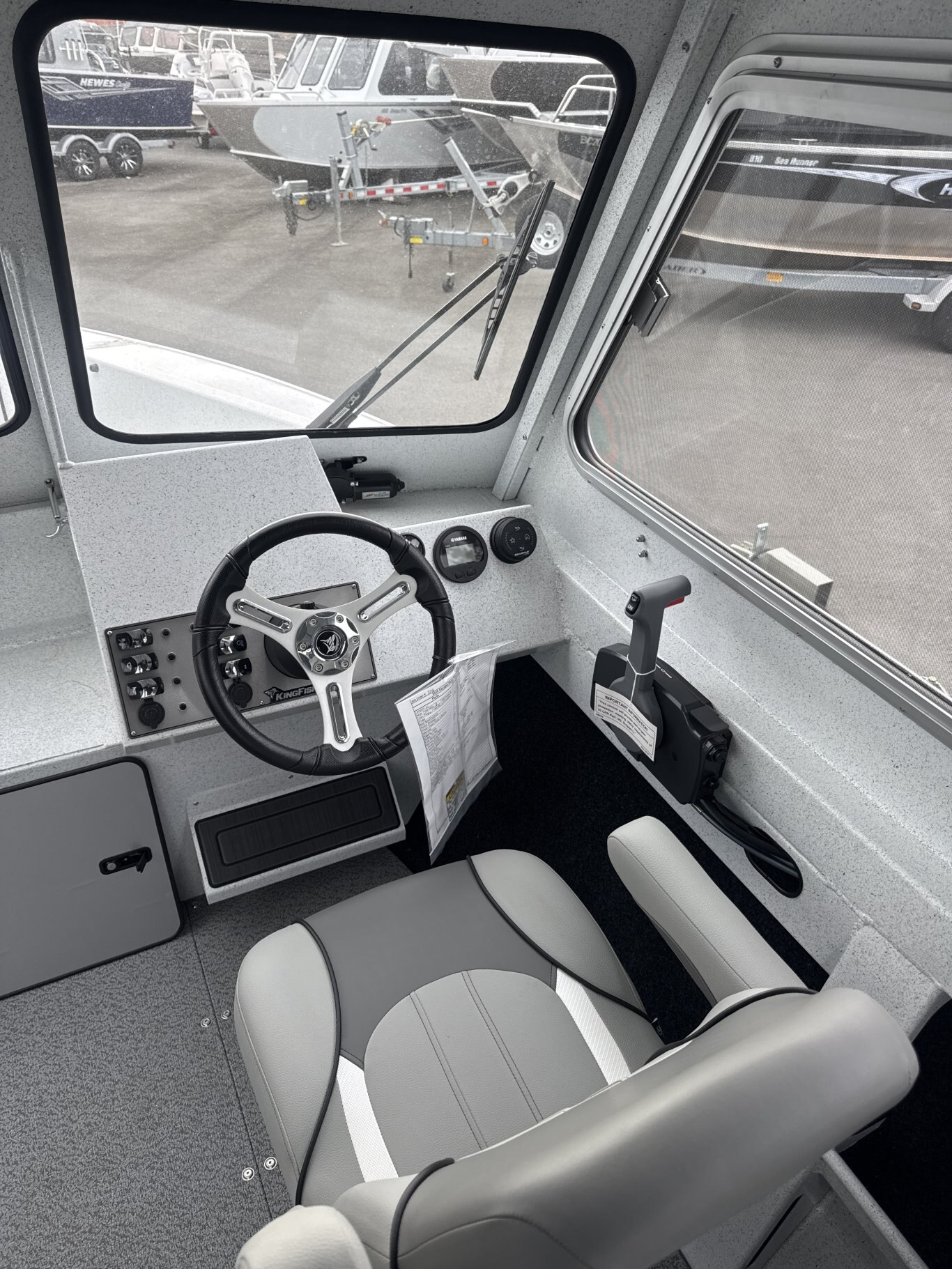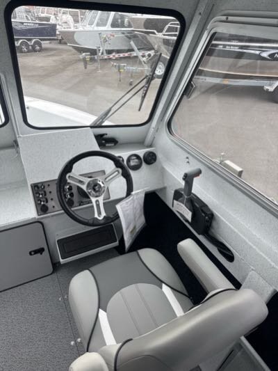 - Aft sloping windshield with tempered glass front windows and 2 aluminum framed sliding side windows