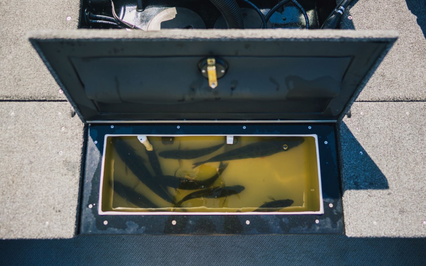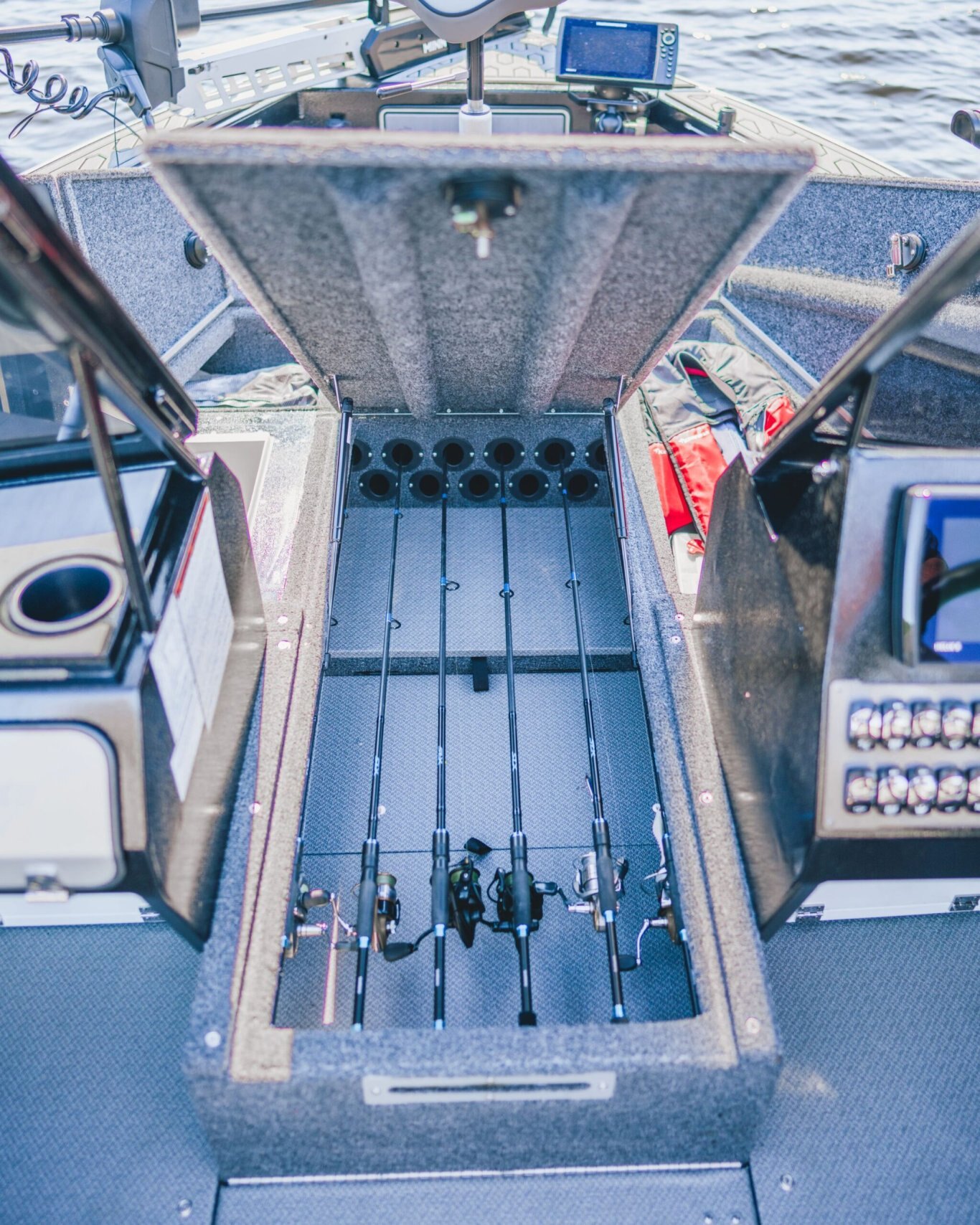 Standard Interior Features Speckle painted interior Carpeted marine flooring throughout KingDeck Marine material – bow, gunnels & cockpit interior accents Rear mounted re-circulating aerated livewell with timer Center bow deck rod storage for 11 rods (7′ 6″ to 8′ in length) Cockpit storage for 4 rods Sure Catch rail system for gunnel mounted accessories Bow platform dry storage and cargo nets Under floor ski and board storage Lockable side storage 9 drink holders 1 swivel Pro Angler seat on permanent pedestal mounted at helm 2 swivel Pro Angler seats with pinchless hinges on removable pedestals 5 unilock removable pedestal bases (1 bow, 1 aft, and 3 in cockpit) Folding rear jump seats XL dash for flush mounted electronics Anti-feedback steering with sport steering wheel and tilt helm Kicker throttle bracket Anchor light storage