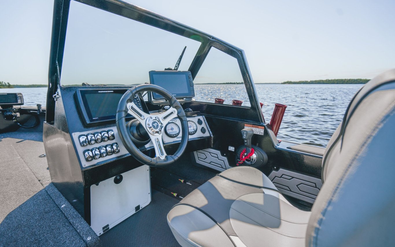 Belted Package Pro Angler seat with uni-lock removable pedestal Port & starboard smooth moves ultra suspension upgrade Heavy duty square tube canvas 1/2 top with storage boot, side curtains, sloper curtain & bow cover Port & Starboard pantographic windshield wiper Aluminum gunnel mounted rod holders (4 per side) Additional electric bilge pump with auto switch