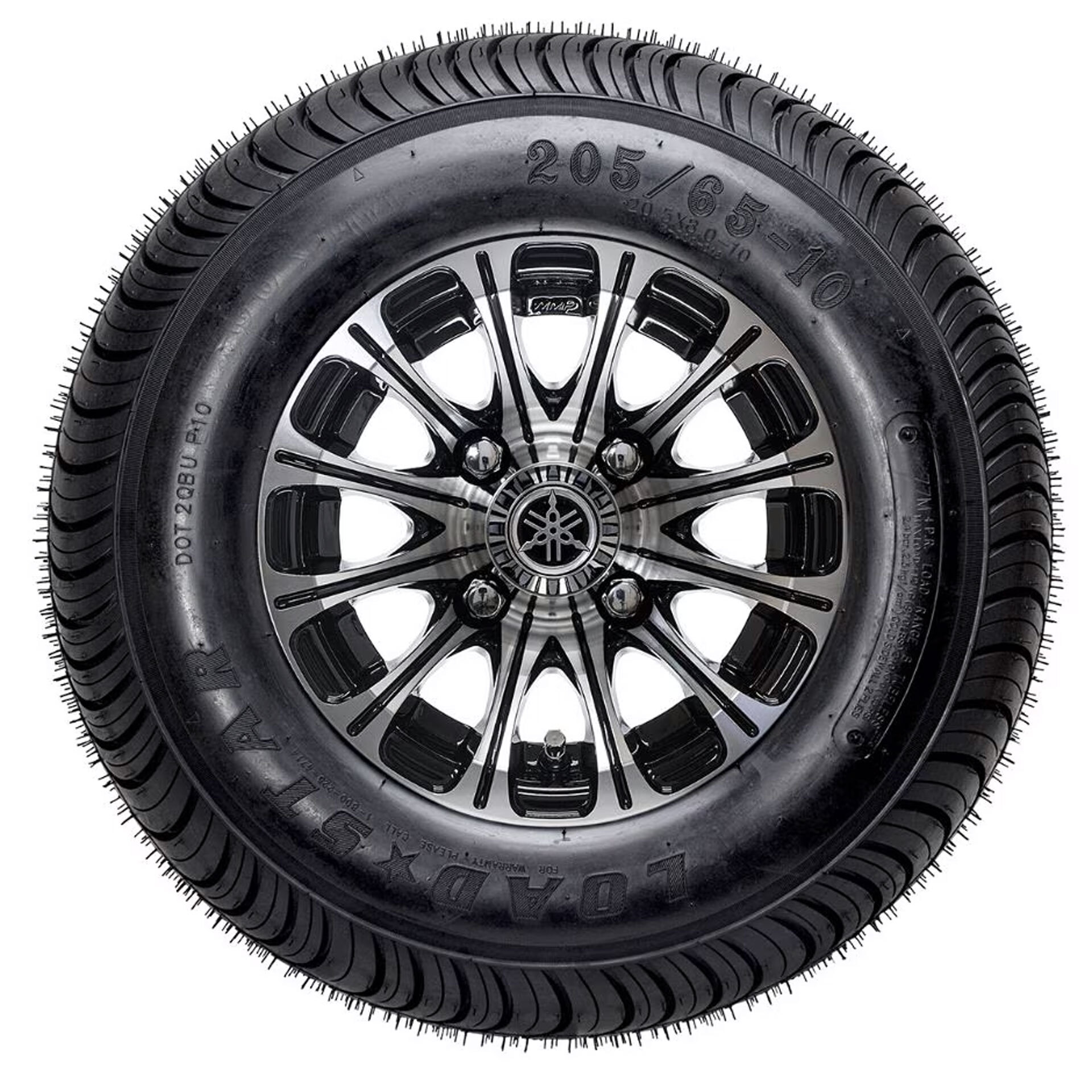 This easy, direct replacement PTV wheel assembly includes Kenda Loadstar 205/65-10 DOT tire with chrome acorn lug nuts, valve stem and Yamaha Tuning Fork logo chrome center cap. Machined finish. (Sold individually).