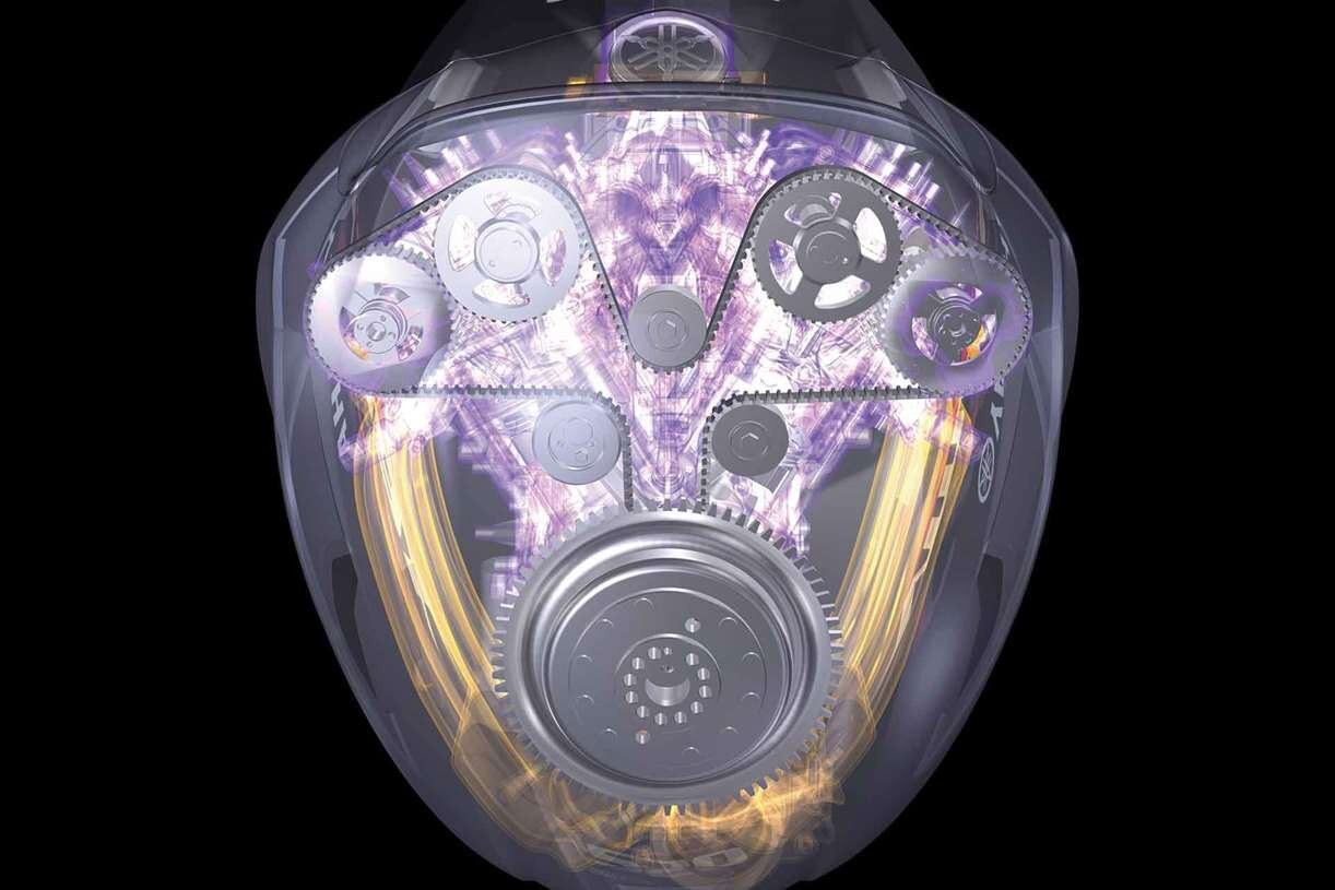 Powerful Yet CompactYamaha's exclusive "In-Bank" exhaust system exits downward through the center of the engine between the "V" of the cylinders, rather than on the exterior side. This increases combustion efficiency for more power and torque, and also provides for a more compact shape. |